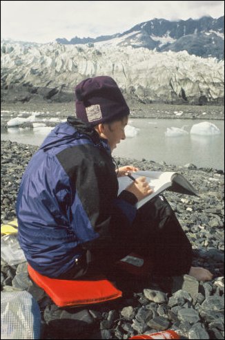 Cat does a quick watercolor pencil sketch of the glacier's many shades of white, tan, and blue-green.